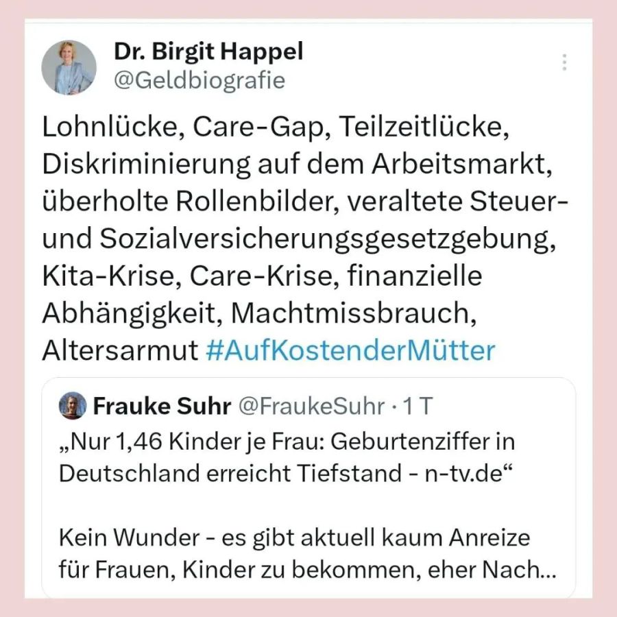 Eltern führten noch die Rentenlücke, Mental Load und die gläserne Decke an. Dazu kommen u.a. Child Penalty, Vermögenslücke, Funding Gap, Financial Service Gender Gap, Inheritance Gap, Müttermythos, Thomas-Kreislauf, fehlende Entlohnung der Familien- und Pflegearbeit, Unterhaltsprellerei, strukturelle Gewalt an Familiengerichten. Wer genau hinschaut, sieht, was in der Gesellschaft schief läuft. Familien sind die Leidtragenden. Dazu hat Nathalie Klüver ein gutes Buch geschrieben: Deutschland, ein kinderfeindliches Land? Erschienen im Kösel-Verlag.