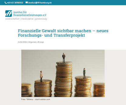 Gemeinsam mit dem iff Hamburg haben wir eine Forschungsförderung eingeworben und untersuchen im Auftrag der Targobank Stiftung die Dynamiken finanzieller Gewalt. Studien zeigen: In fast allen Fällen häuslicher Gewalt spielt auch finanzieller Missbrauch eine Rolle. Dennoch erkennen laut einer US-Studie 78 % der Befragten diese Form der Gewalt nicht.